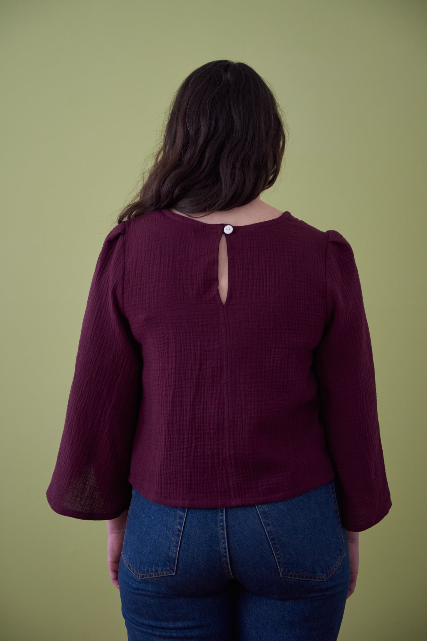 A slightly cropped, loose fitting top with wide bell sleeves and a single loop and button closure at the back of the neck. Made of a lightweight organic cotton double gauze fabric, which is soft and cozy with a slightly waffled texture. Fit is pretty similar to the high neck tank, but with a little extra ease and big floaty sleeve!